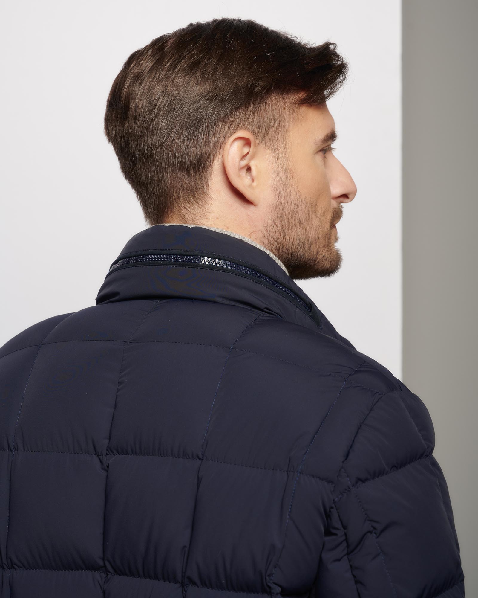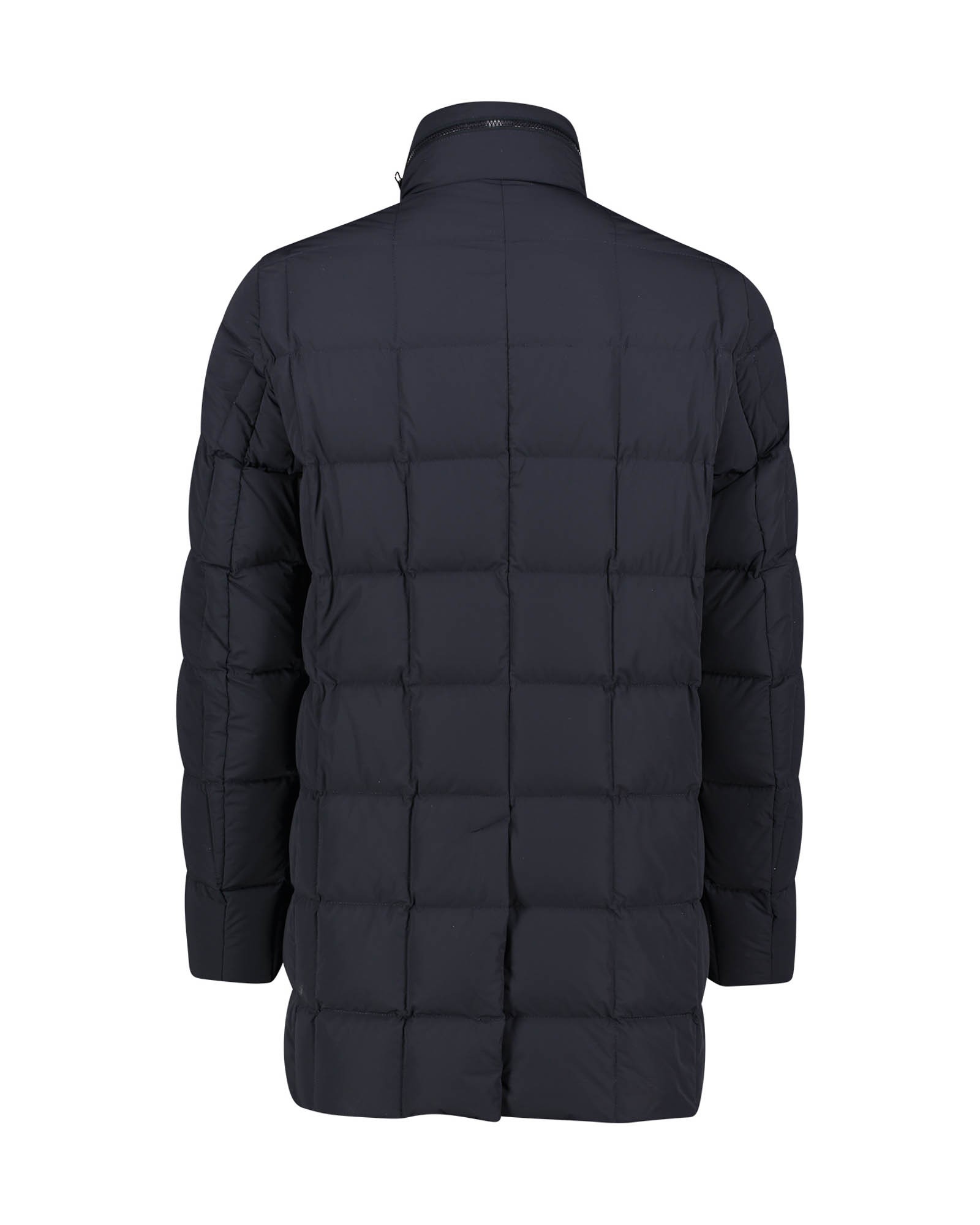 Giaccone trapuntato a sandwich imbottito di vera piuma, chiusura con zip e bottoni